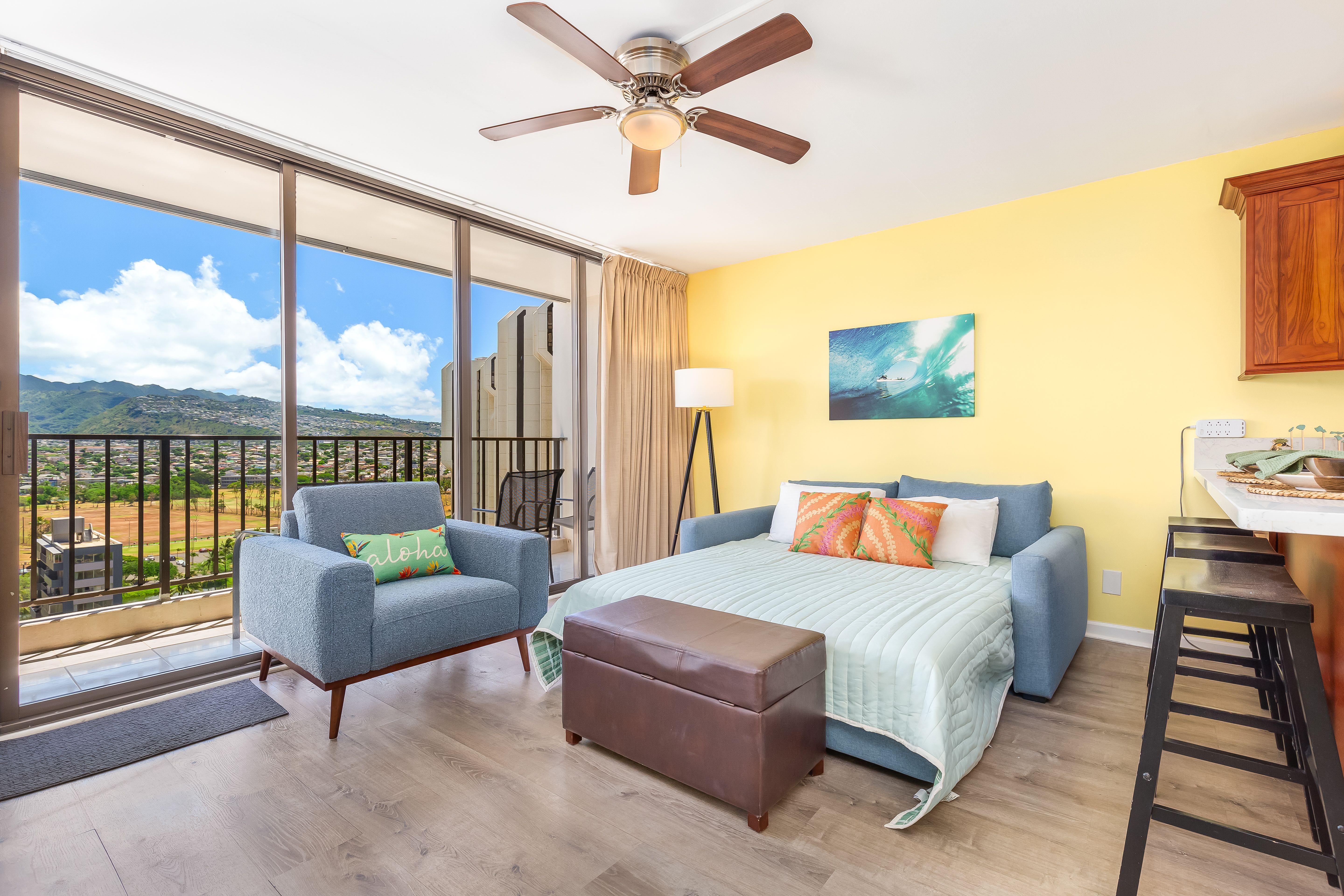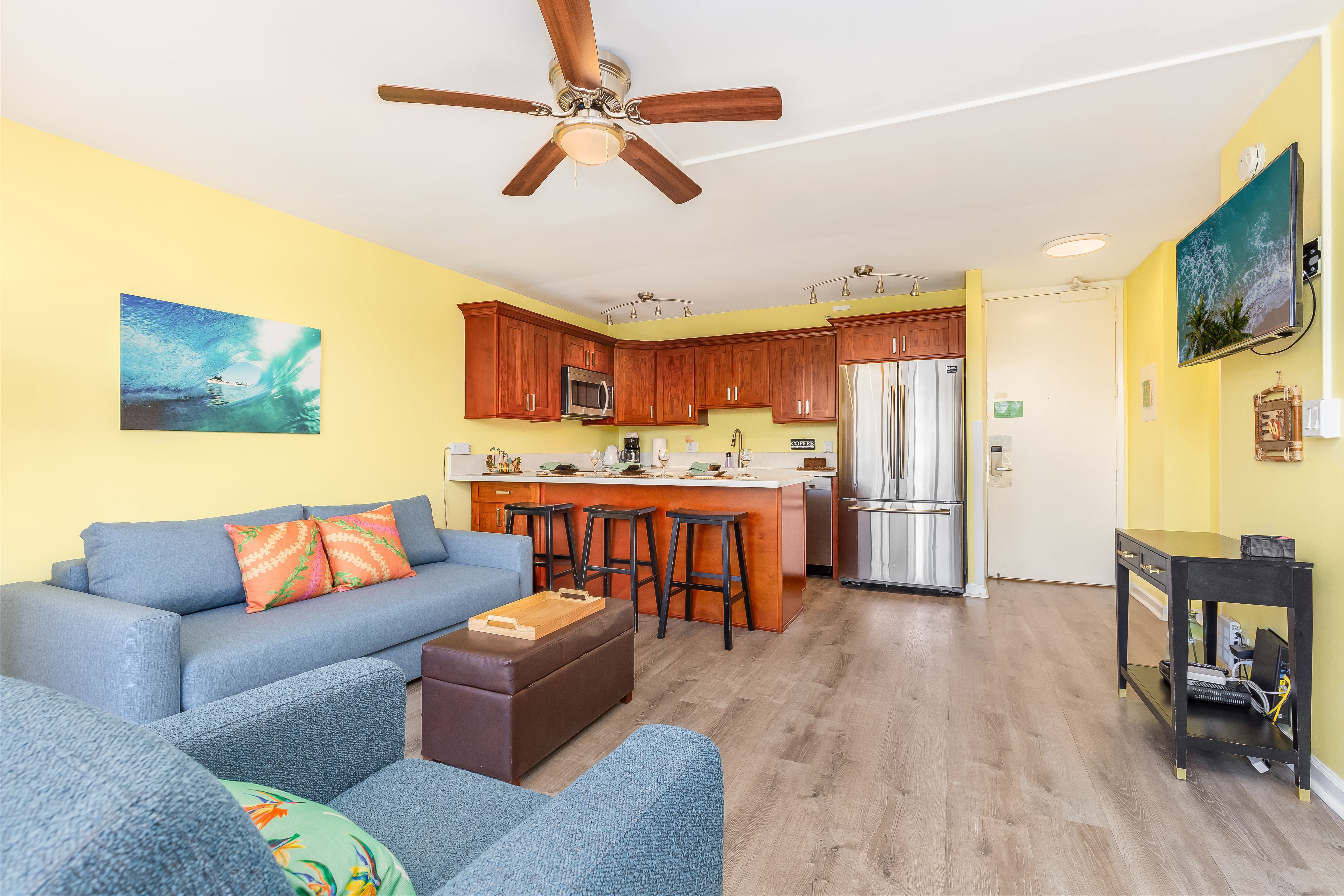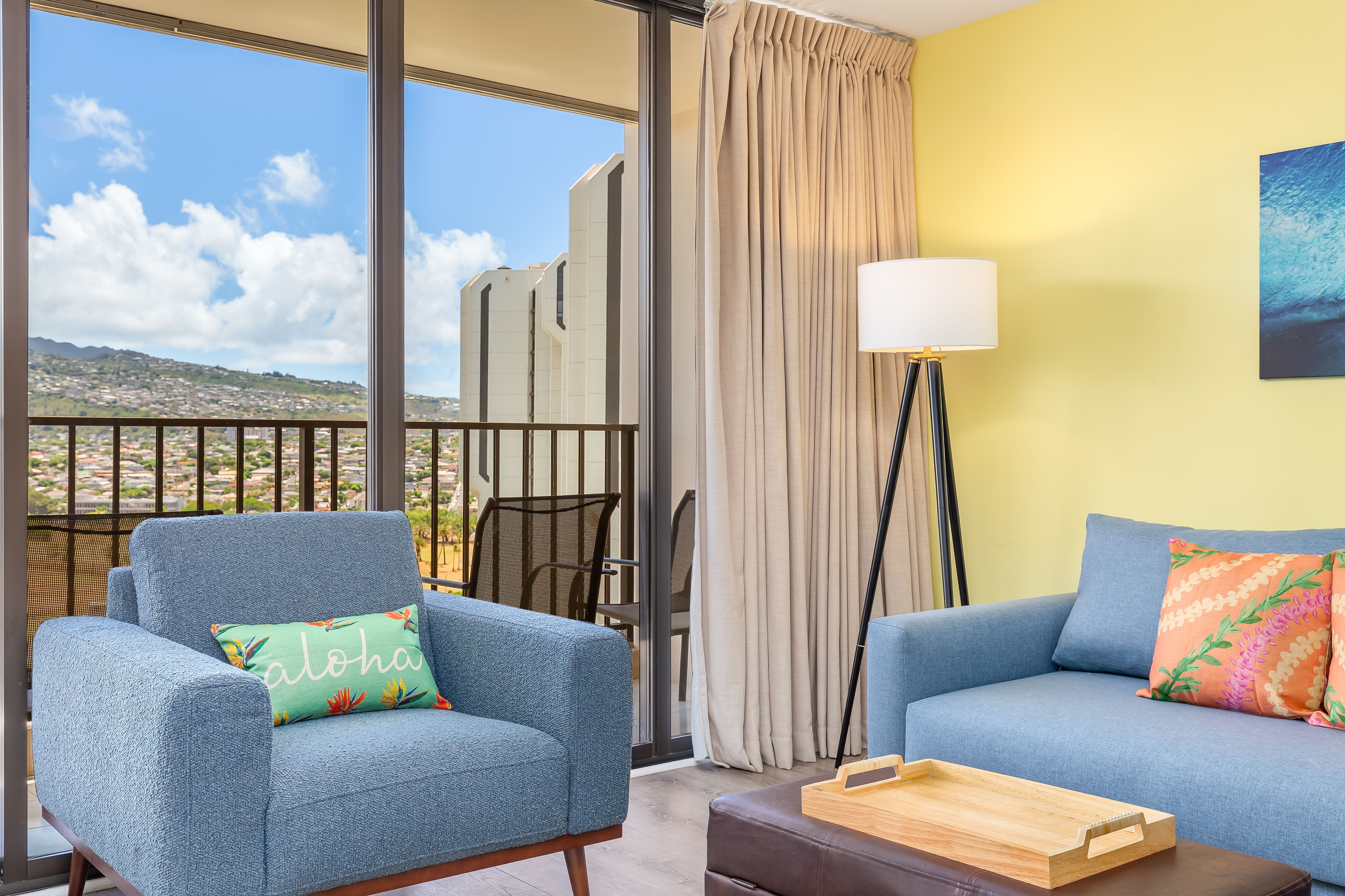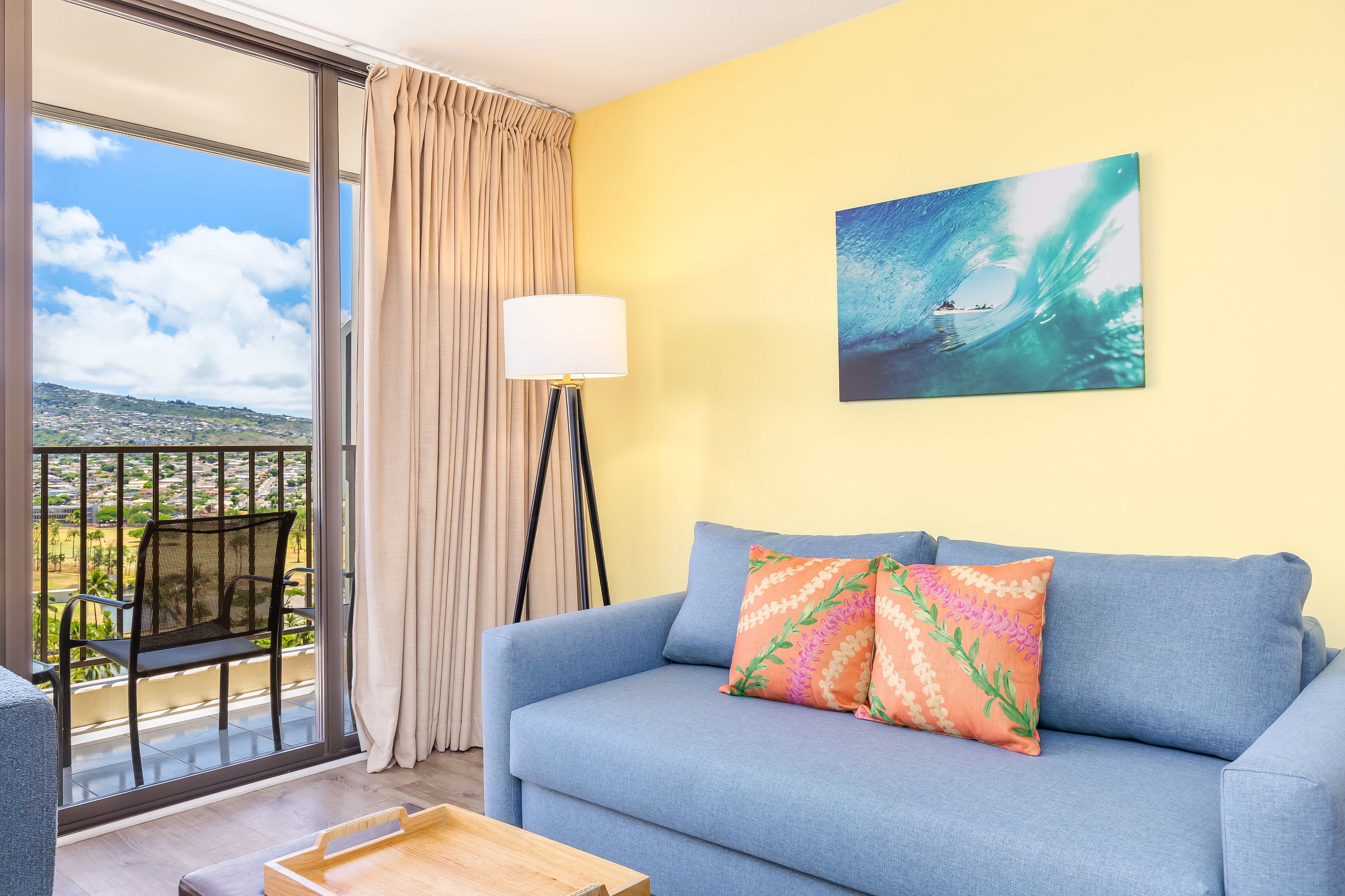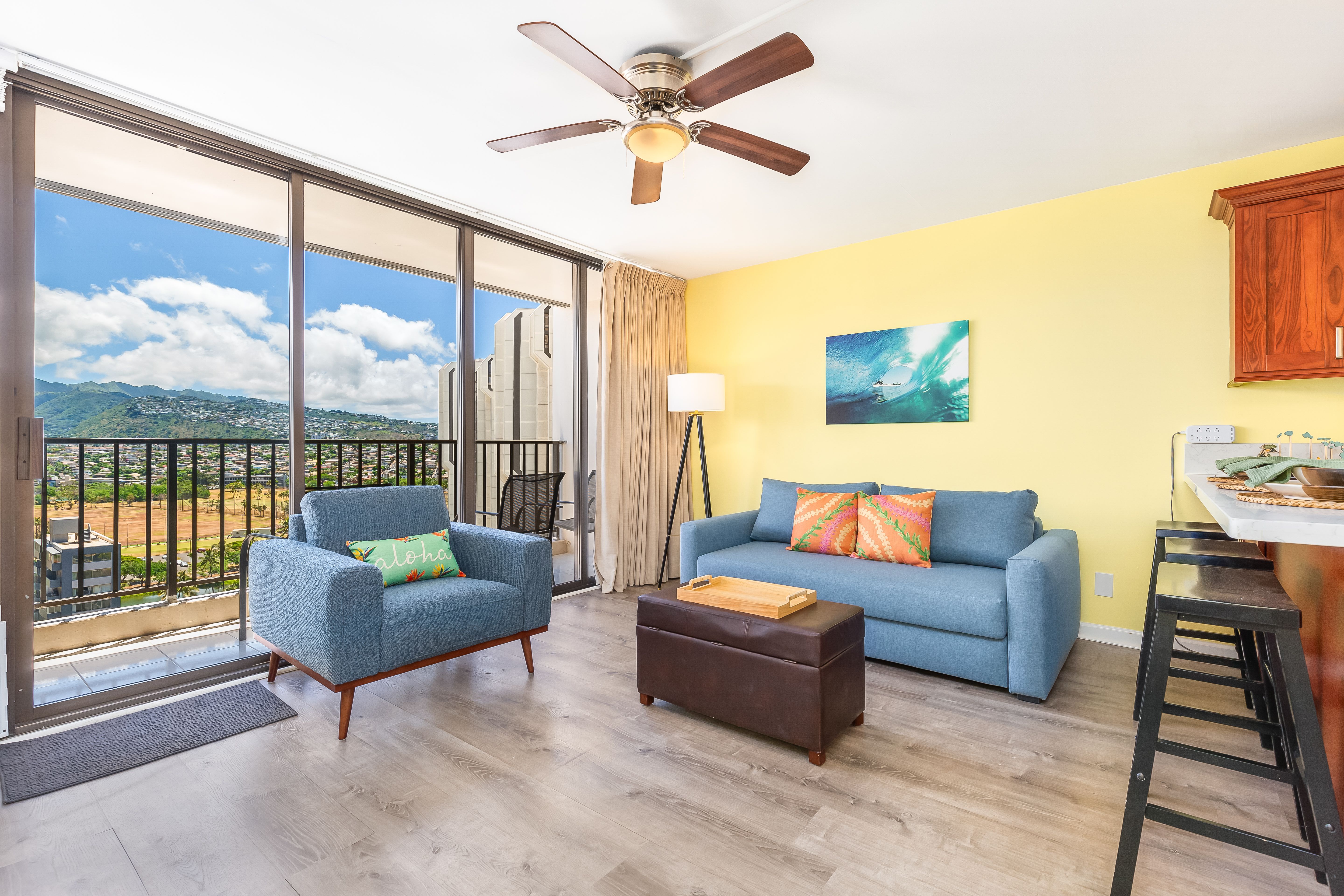 Cozy living room with Hawaiian decor