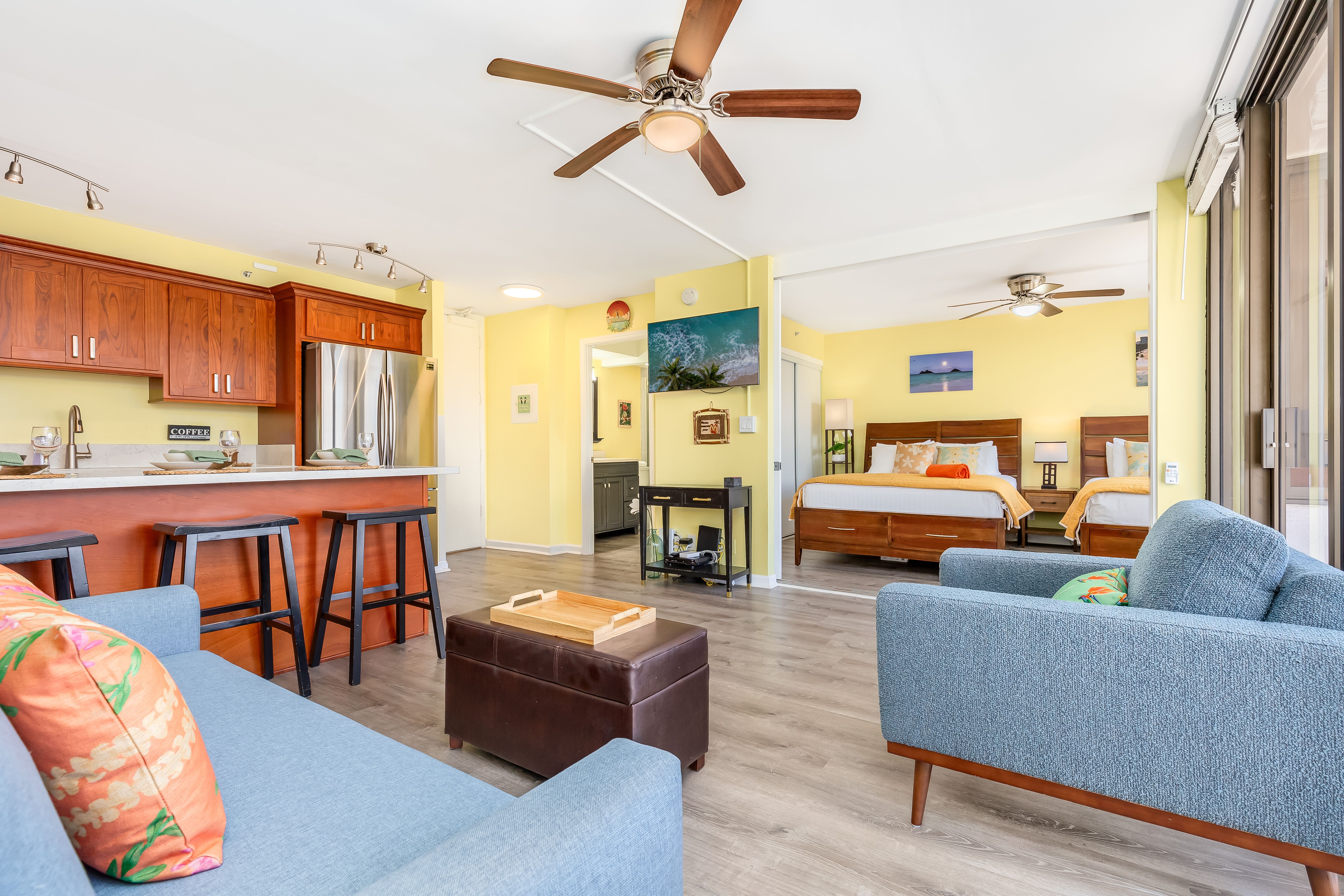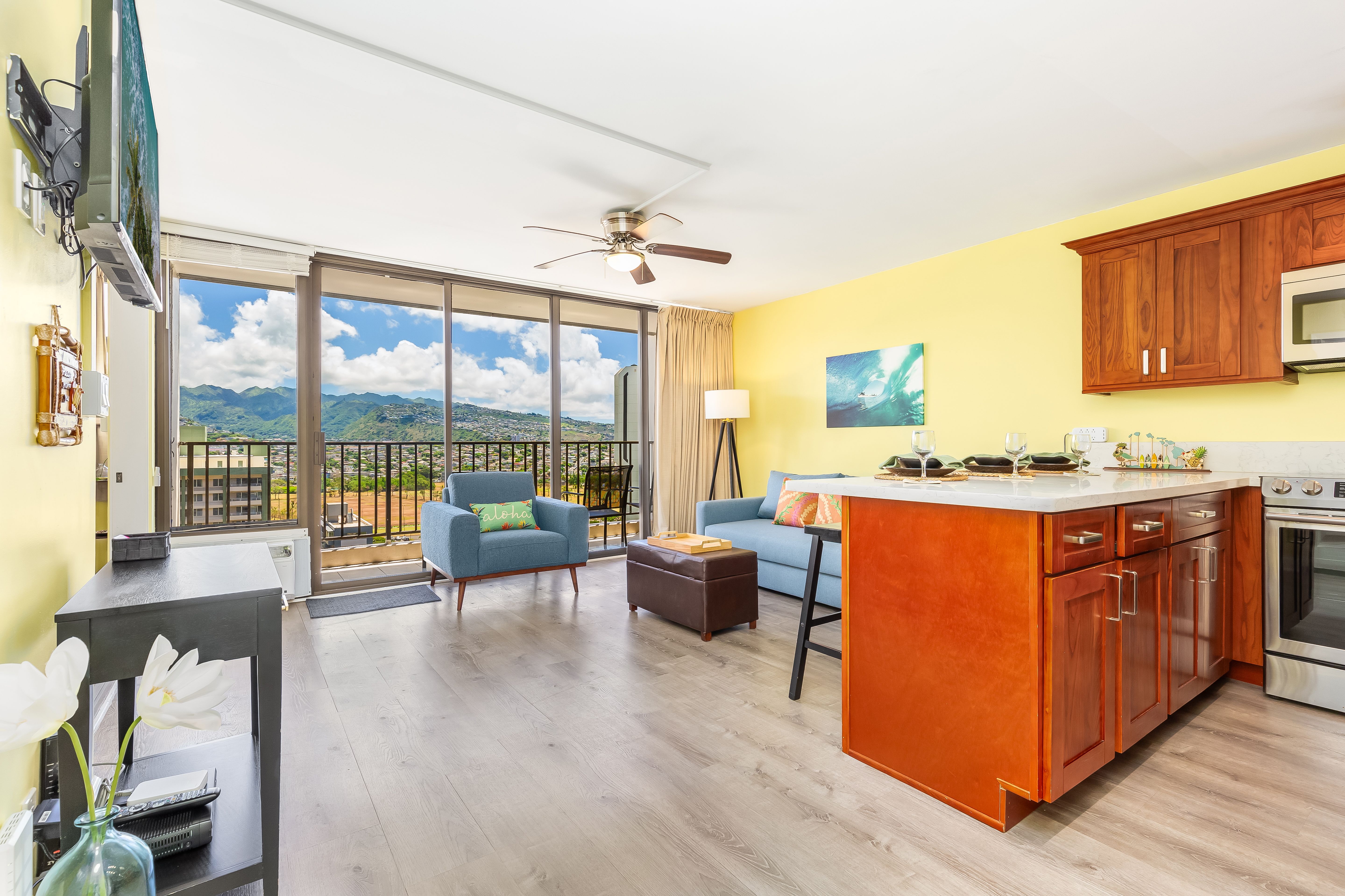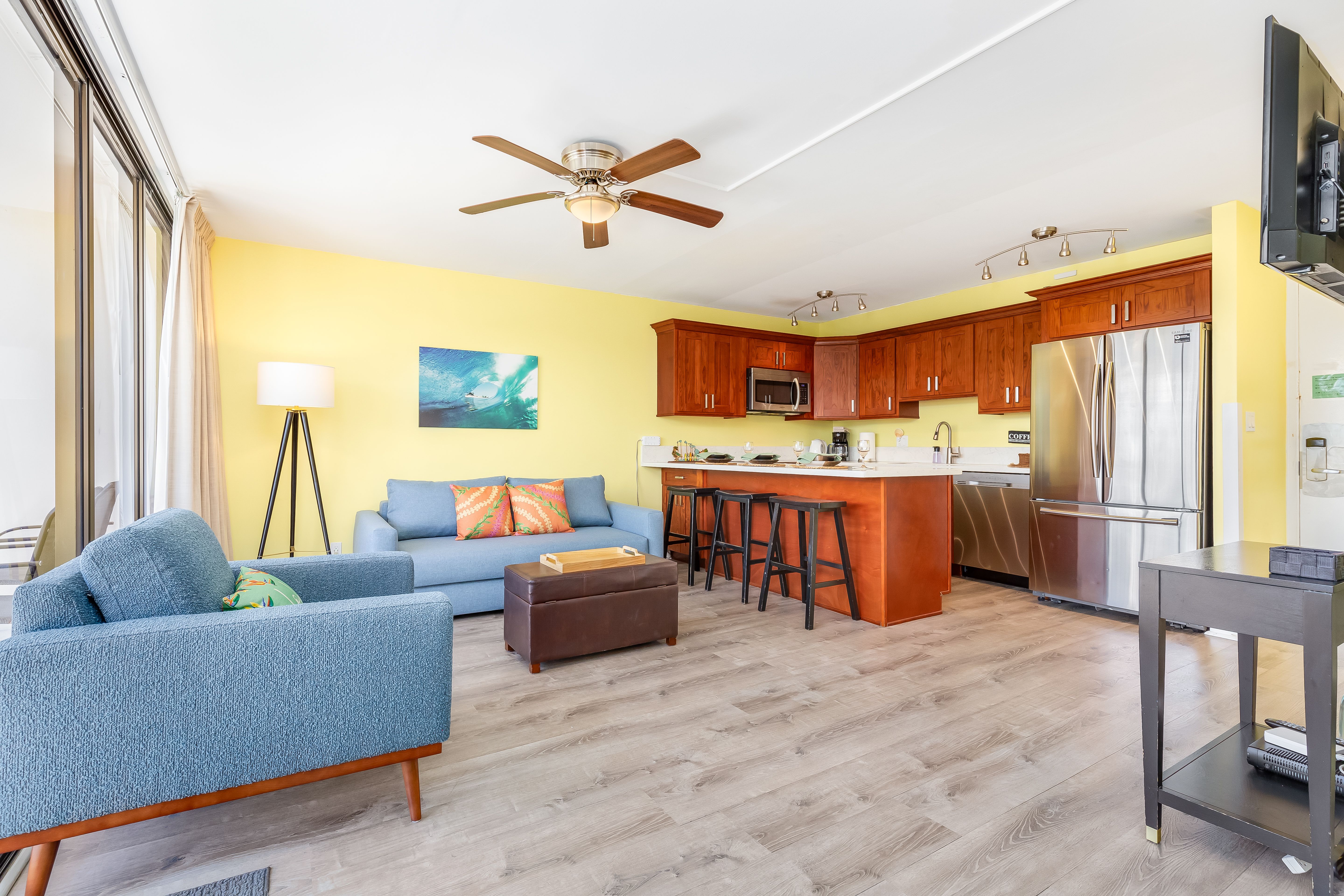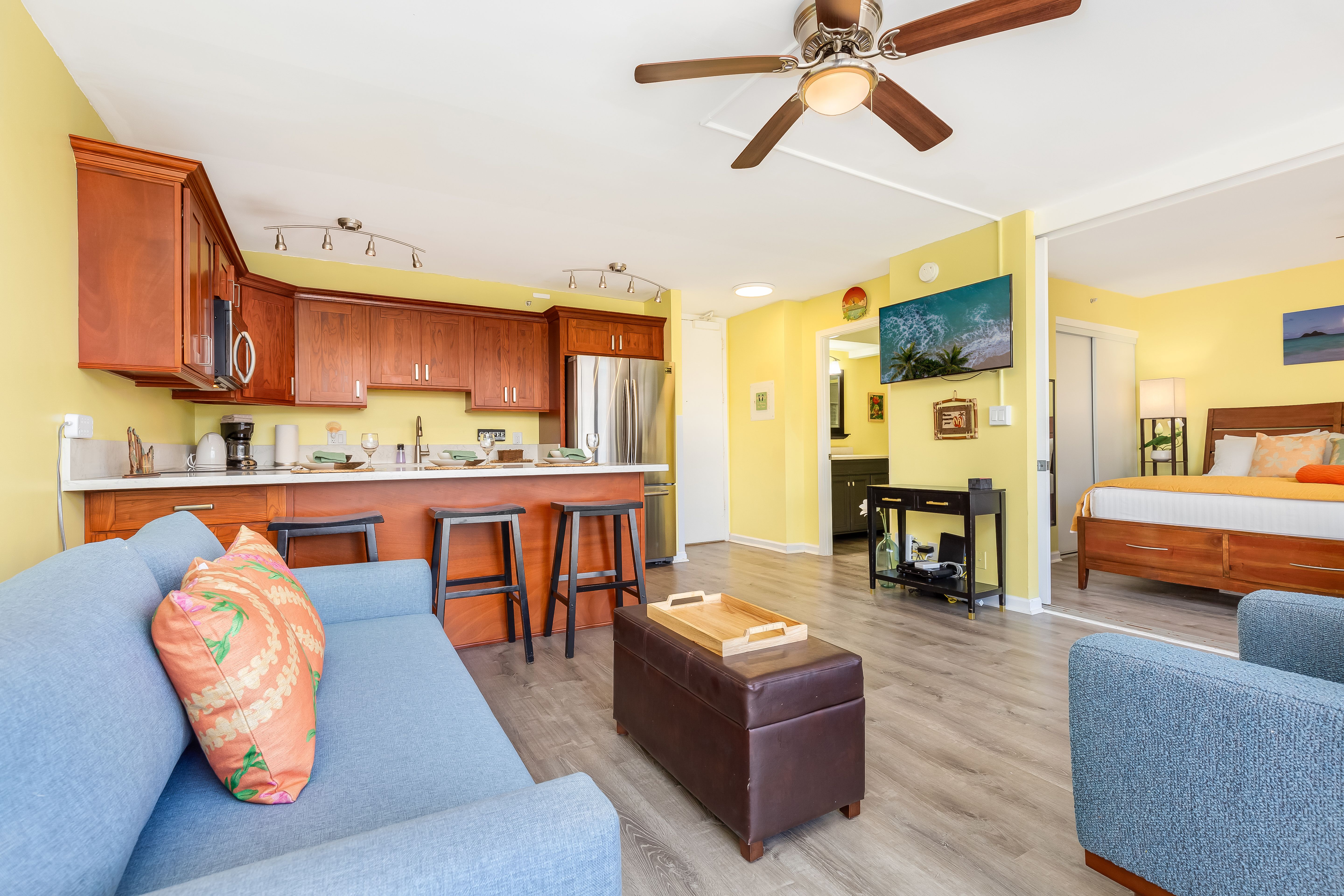 Cozy living room with Hawaiian decor