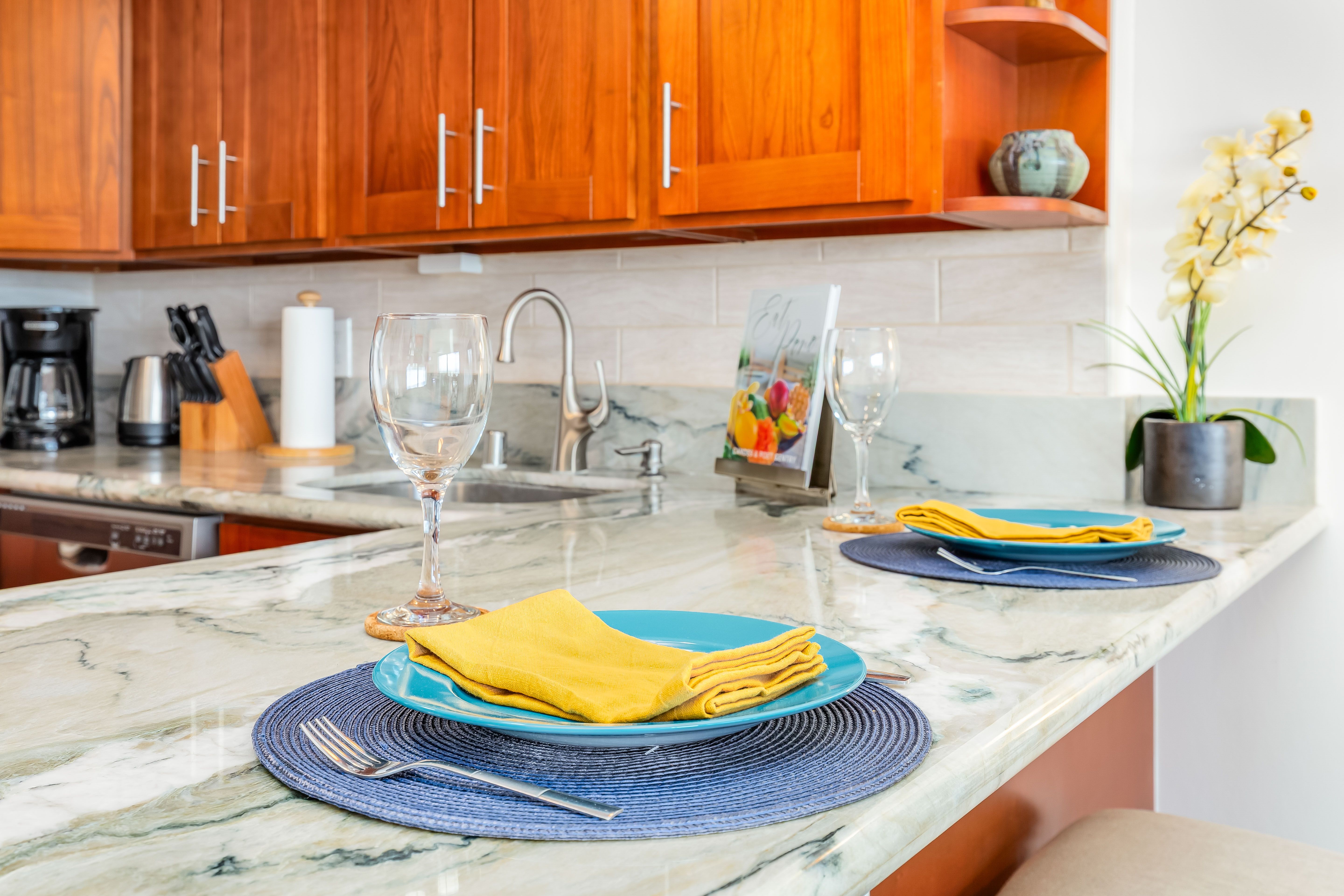 From check in to check out a easy experience. This definitely a single person or a couple only rental. Reason being is there no separation from the bedroom. So if you want to have your morning coffee and enjoy that SPECTACULAR view the sound will wake others up. We have stayed at the Ilikia many times, this was the first time with view of the marina. The Sunsets are amazing but you don’t see the fireworks on Friday but you get that sunset every evening enjoying dinner on the lanai. Plenty of appliance and kitchen utensils. Lots of good quality towels in the bathroom.
