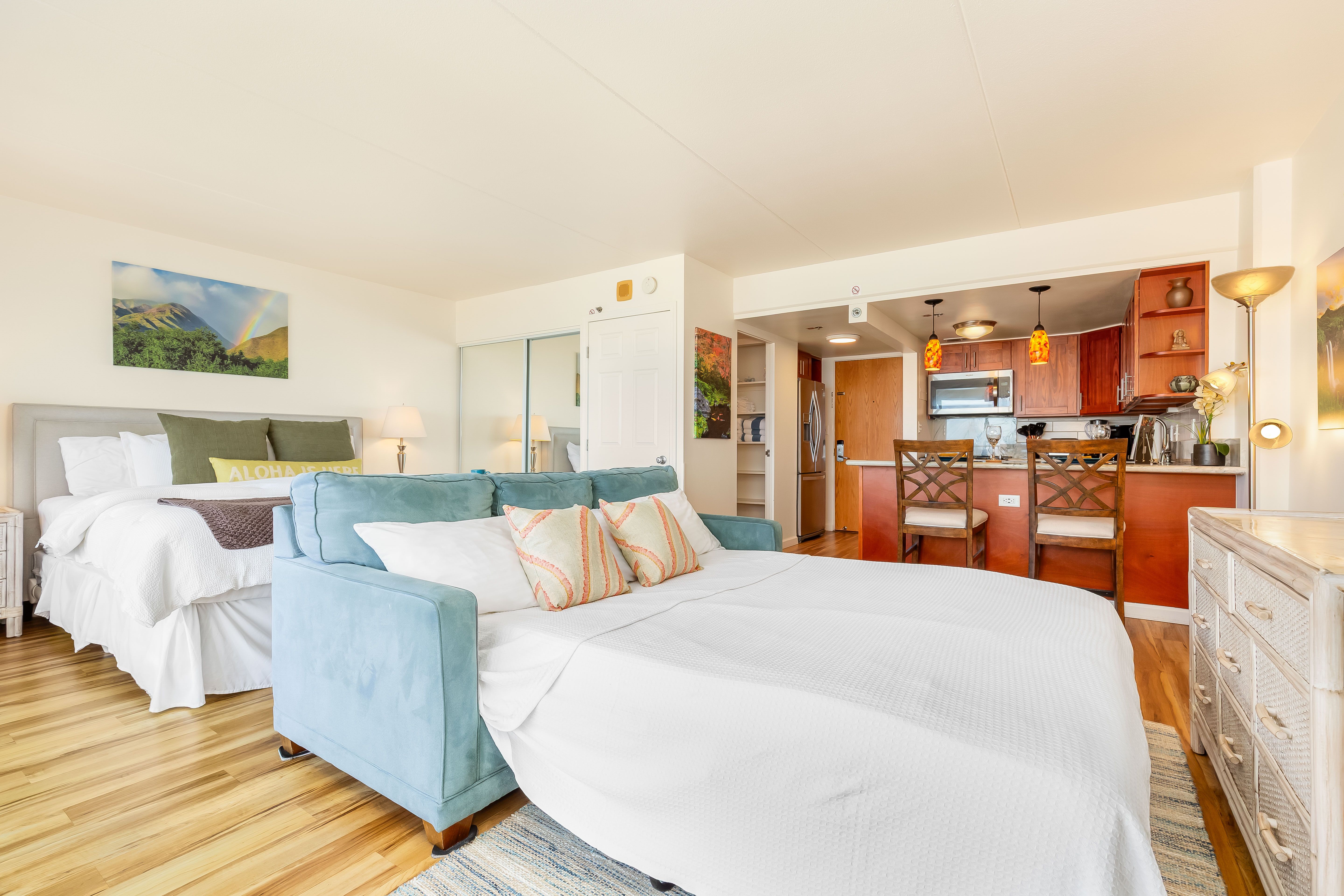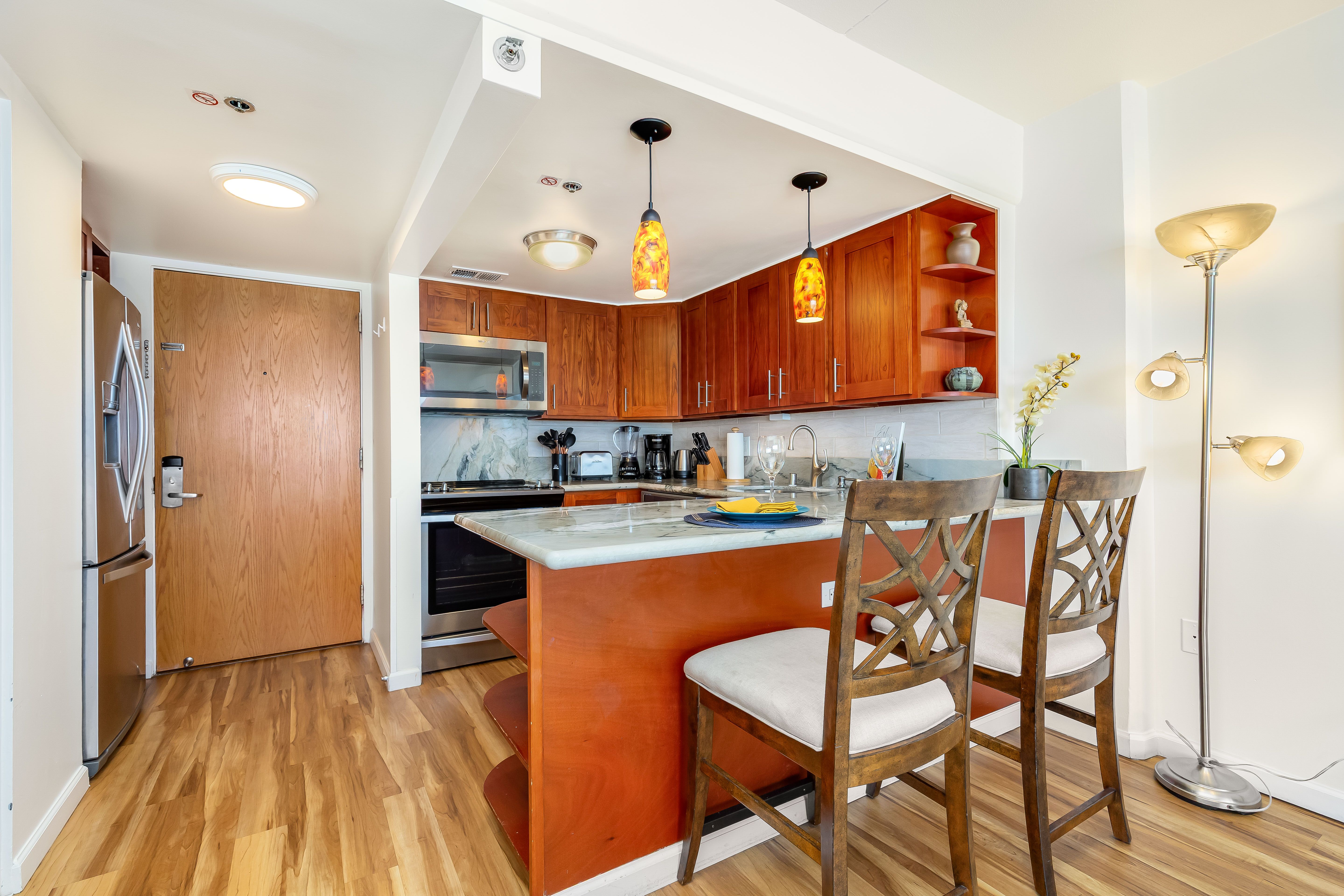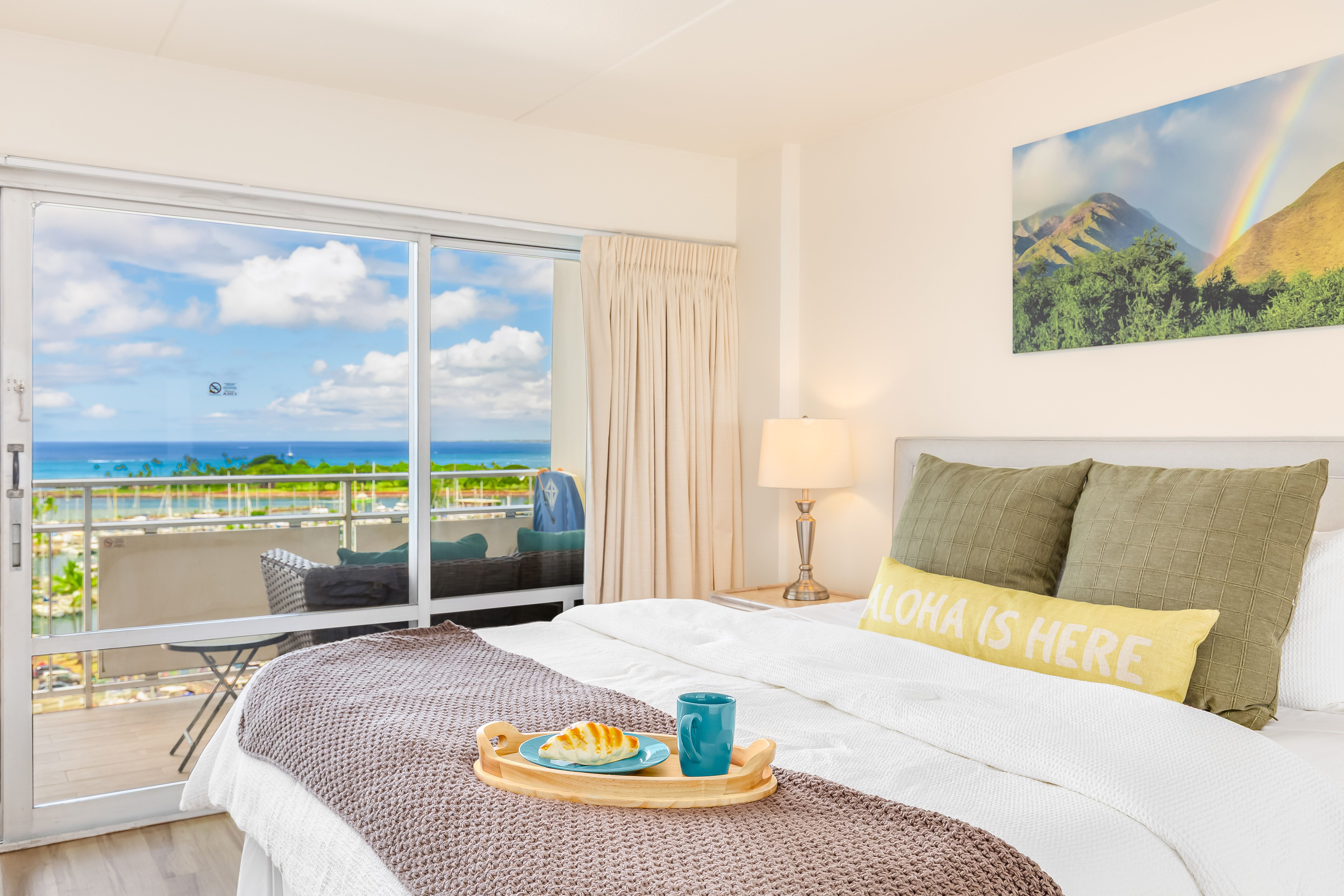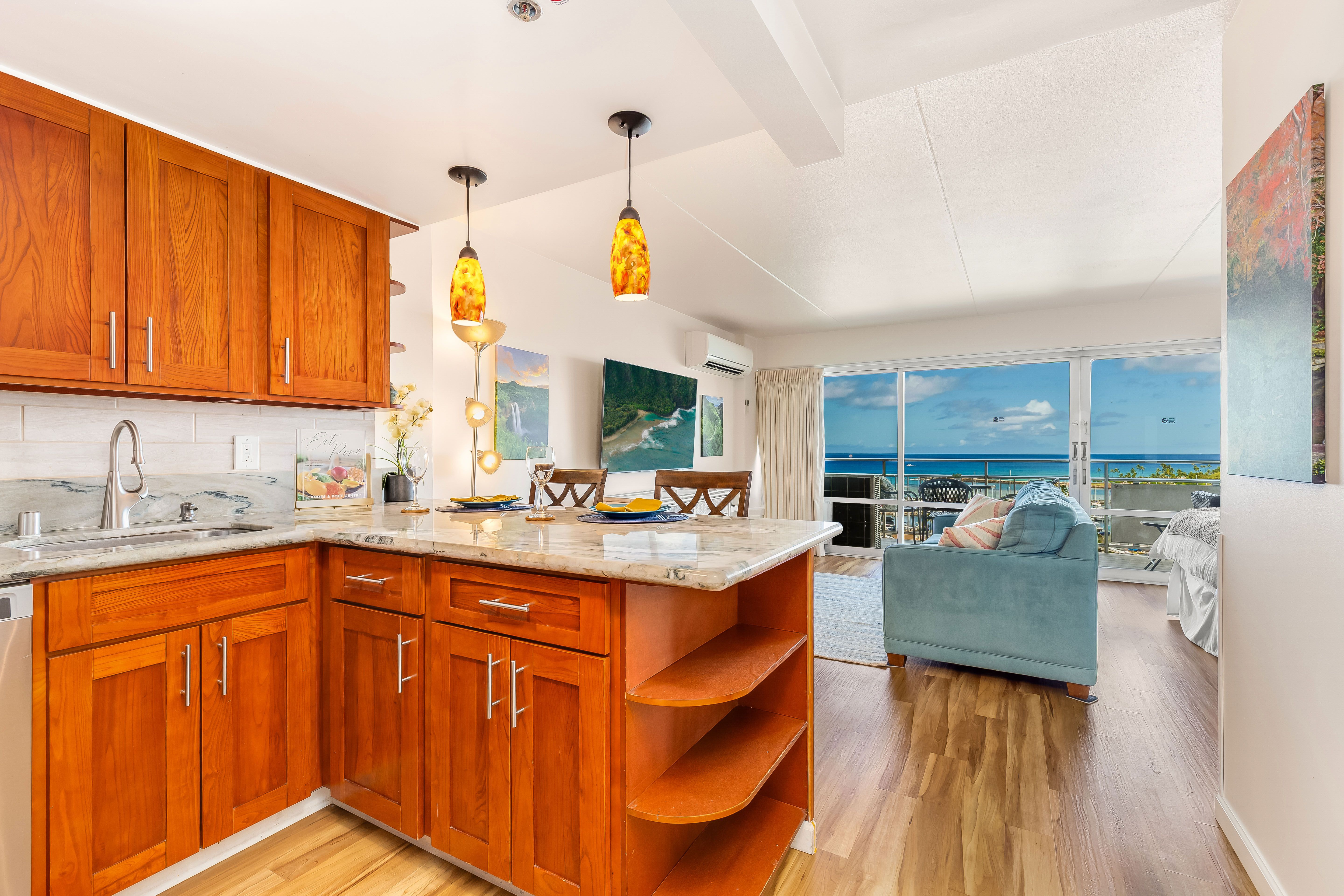 This is our second time staying at this condo! We loved it the first time and loved it now. You walk into the kitchen area with updated appliances and full size refrigerator. The cabinets were a beautiful dark wood that complimented the lovely granite countertops. The granite countertops of white/gray with swirls of delicate blue green throughout were in the kitchen and bathroom. I wish I had it in my home. The turquoise plates and cups were beautiful to use. Everything you could need was in the kitchen and the black with copper accents on the cooking utencils was quite the touch. There are 3 very comfortable high chairs at the bar eating area. The turquoise queen size couch/sleeper was very comfortable. The king size comfy bed had accent pillows of a turquoise print that complimented the ones on the couch to pull the whole look together. The footstools, furniture and TV were great. The floors a beautiful hardwood. The lanai was comfortable with a table, chairs and a comfy love seat with glass tables to put your drinks. The VIEW IS AMAZING! You look out to the Pacific ocean of blues/greens and blue skies. You see the marina with palm trees all over. You see rainbows that take your breath away. You also see Ala Moana Bay Beach. Nothing blocks your view. Its quiet, relaxing and beautiful. The people we worked with reserving this lovely condo were great to work with at anytime. The location is outstanding. You are a 5 minute walk from Waikiki Beach and 7 mins from Ala Moana Bay Beach. You have souvenir shops, grocery shops, clothing, shops with all you need within walking distance. You can catch any bus to anywhere rght outside the Ilikai. the shops that are a part of the Ilikai are great. You will love eating at Cinnamons (part of the Ilikai) and we suggest the pancakes for breakfast (yum), coffee shops, clothing, ice cream (rated number 1) and a shop for everything you might need. We loved staying here and hope to stay again.