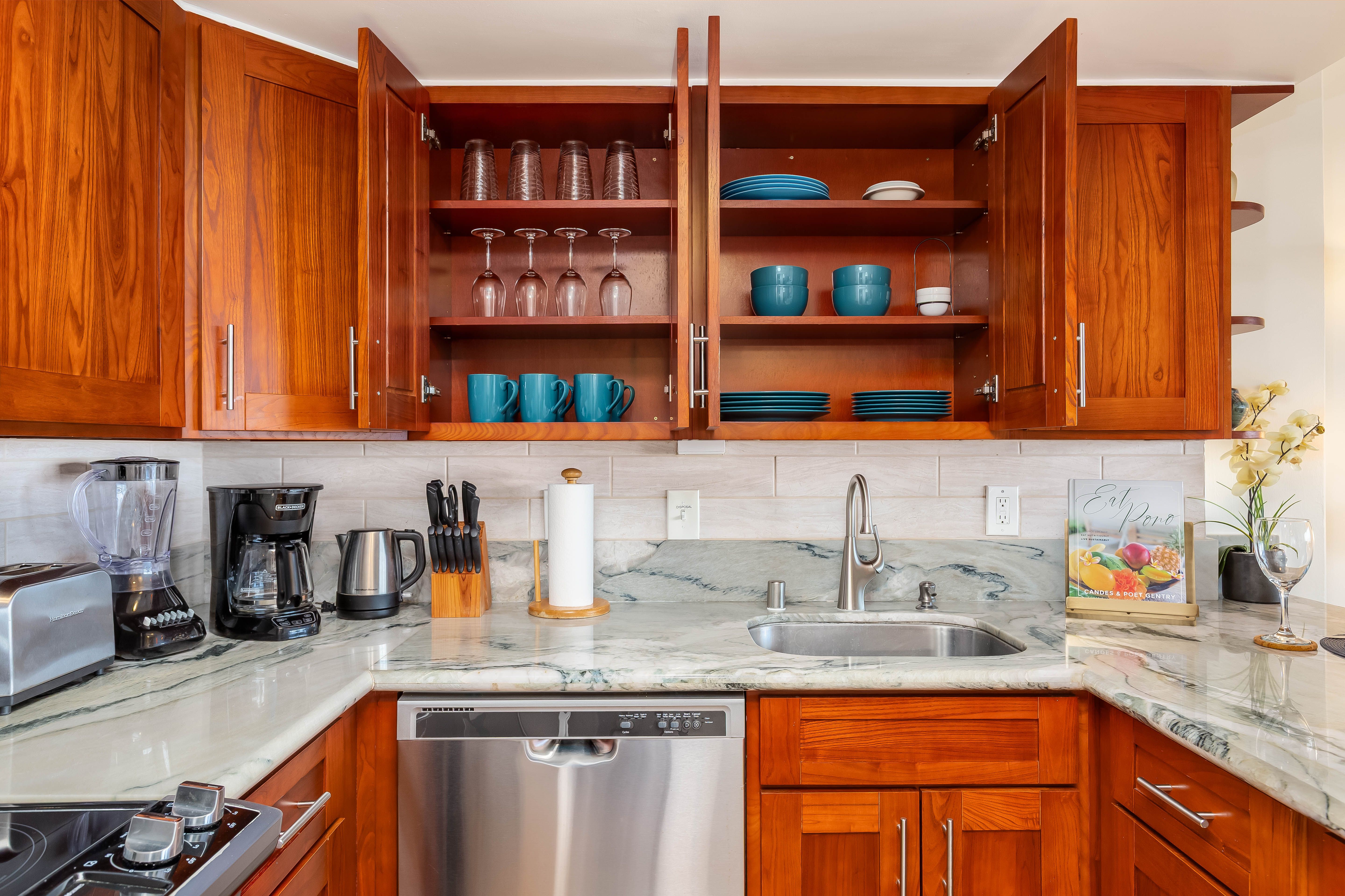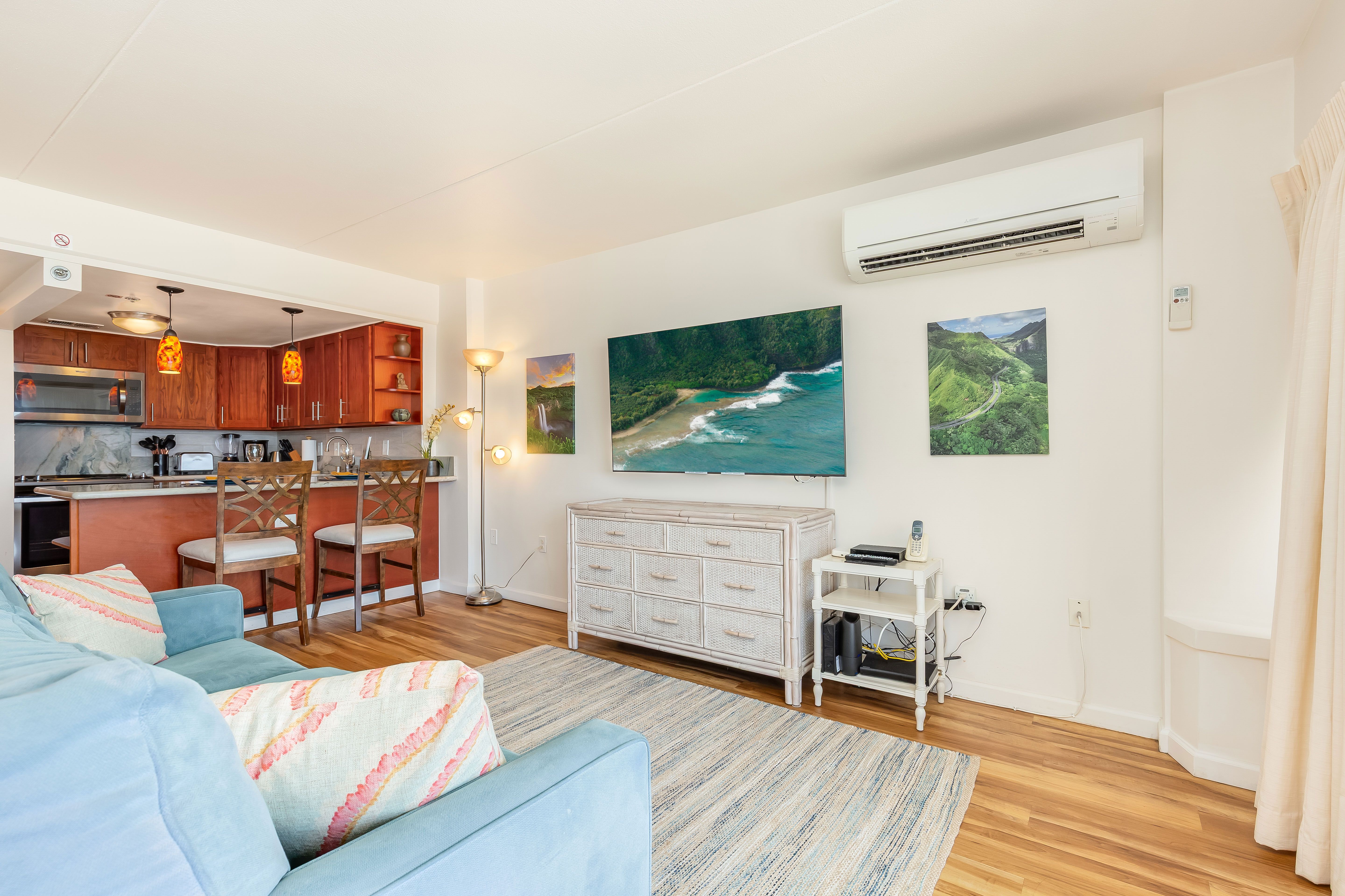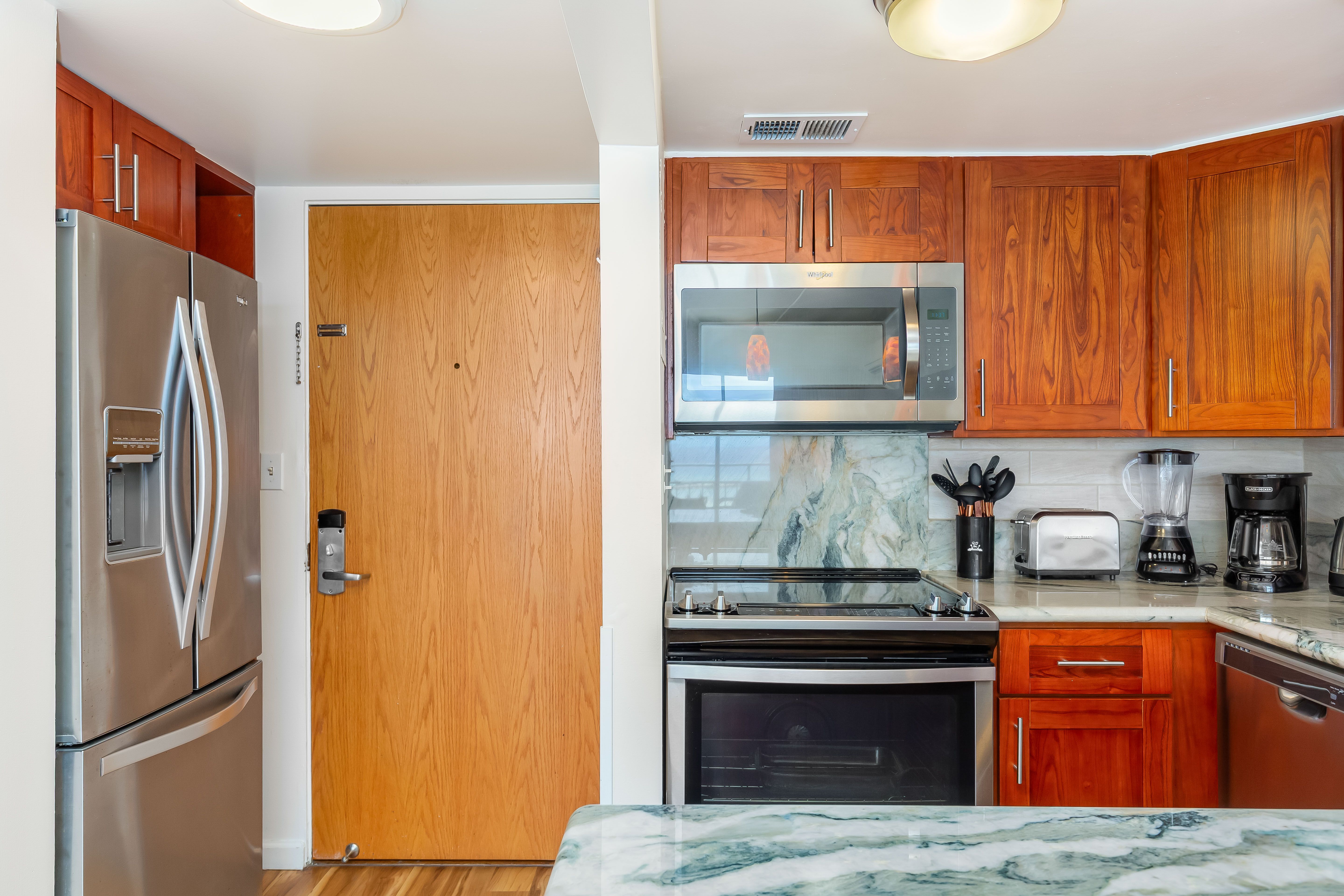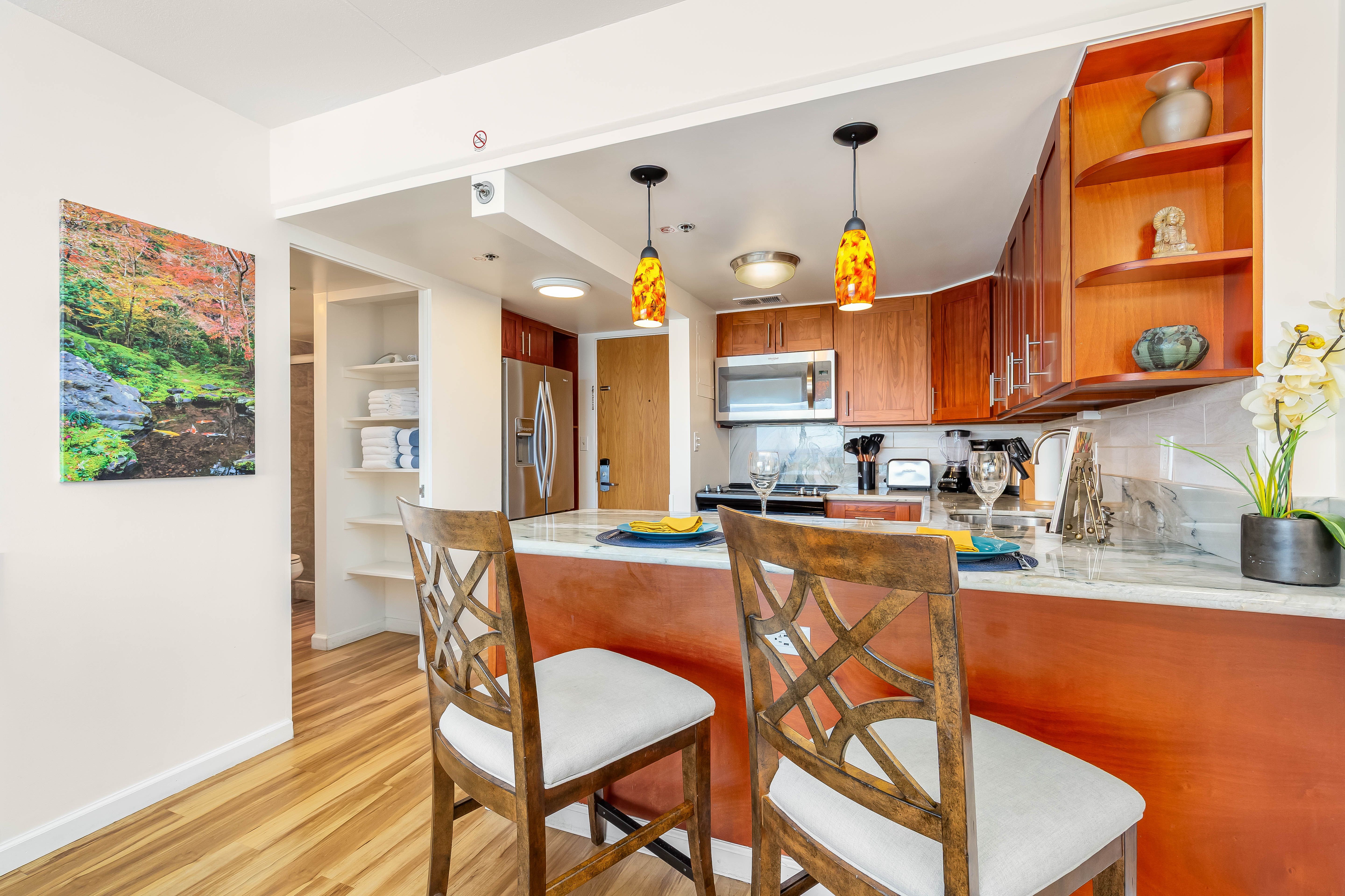This is our second time staying at this condo! We loved it the first time and loved it now. You walk into the kitchen area with updated appliances and full size refrigerator. The cabinets were a beautiful dark wood that complimented the lovely granite countertops. The granite countertops of white/gray with swirls of delicate blue green throughout were in the kitchen and bathroom. I wish I had it in my home. The turquoise plates and cups were beautiful to use. Everything you could need was in the kitchen and the black with copper accents on the cooking utencils was quite the touch. There are 3 very comfortable high chairs at the bar eating area. The turquoise queen size couch/sleeper was very comfortable. The king size comfy bed had accent pillows of a turquoise print that complimented the ones on the couch to pull the whole look together. The footstools, furniture and TV were great. The floors a beautiful hardwood. The lanai was comfortable with a table, chairs and a comfy love seat with glass tables to put your drinks. The VIEW IS AMAZING! You look out to the Pacific ocean of blues/greens and blue skies. You see the marina with palm trees all over. You see rainbows that take your breath away. You also see Ala Moana Bay Beach. Nothing blocks your view. Its quiet, relaxing and beautiful. The people we worked with reserving this lovely condo were great to work with at anytime. The location is outstanding. You are a 5 minute walk from Waikiki Beach and 7 mins from Ala Moana Bay Beach. You have souvenir shops, grocery shops, clothing, shops with all you need within walking distance. You can catch any bus to anywhere rght outside the Ilikai. the shops that are a part of the Ilikai are great. You will love eating at Cinnamons (part of the Ilikai) and we suggest the pancakes for breakfast (yum), coffee shops, clothing, ice cream (rated number 1) and a shop for everything you might need. We loved staying here and hope to stay again.