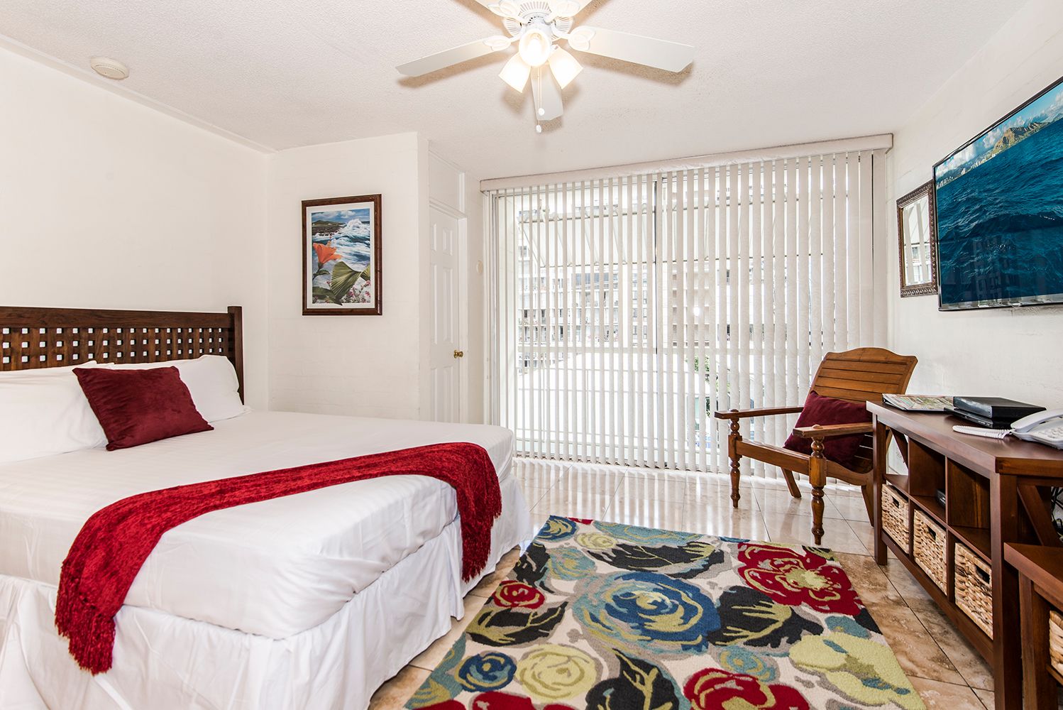 Queen Bedroom with Large Flat Screen TV and Ceiling Fan