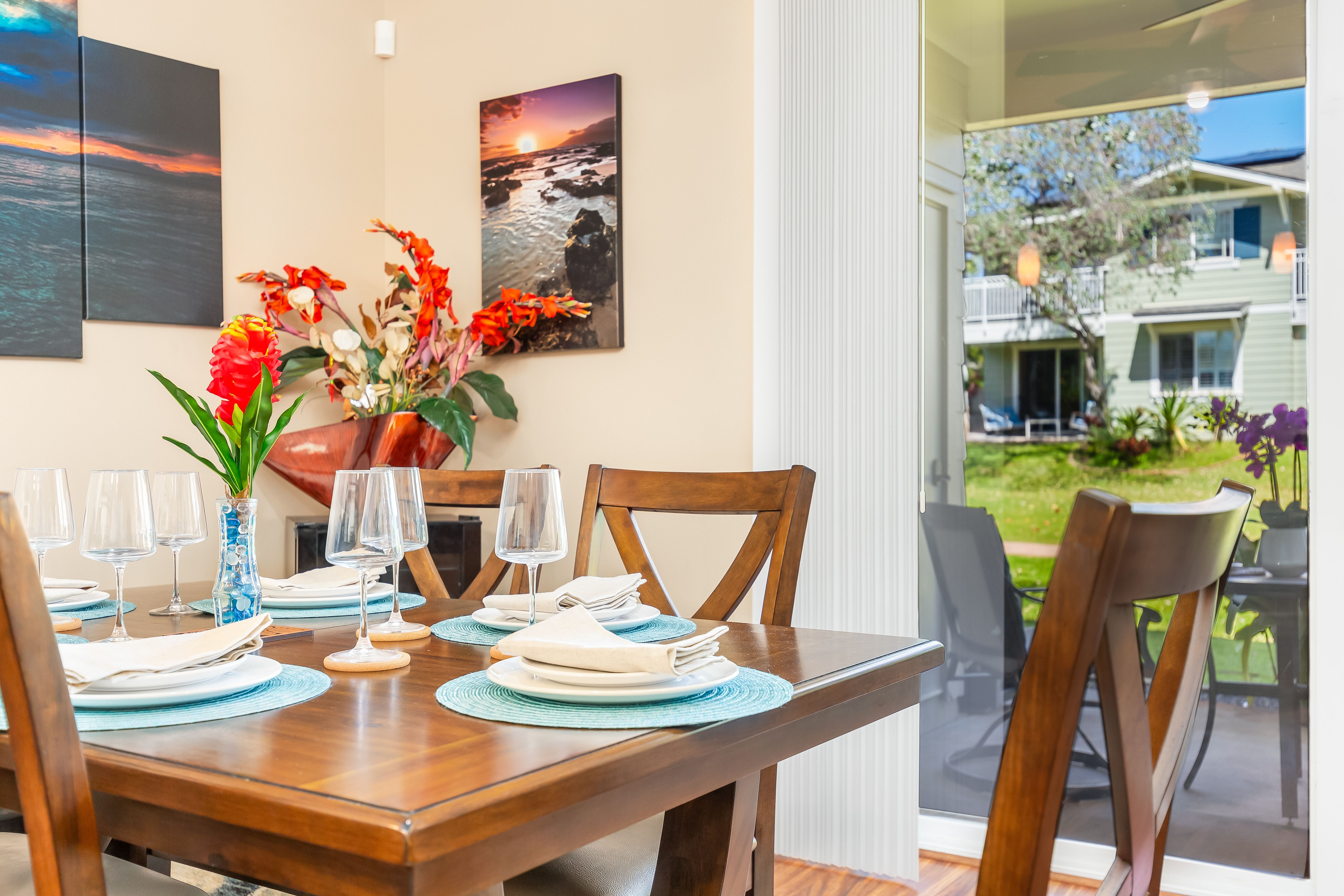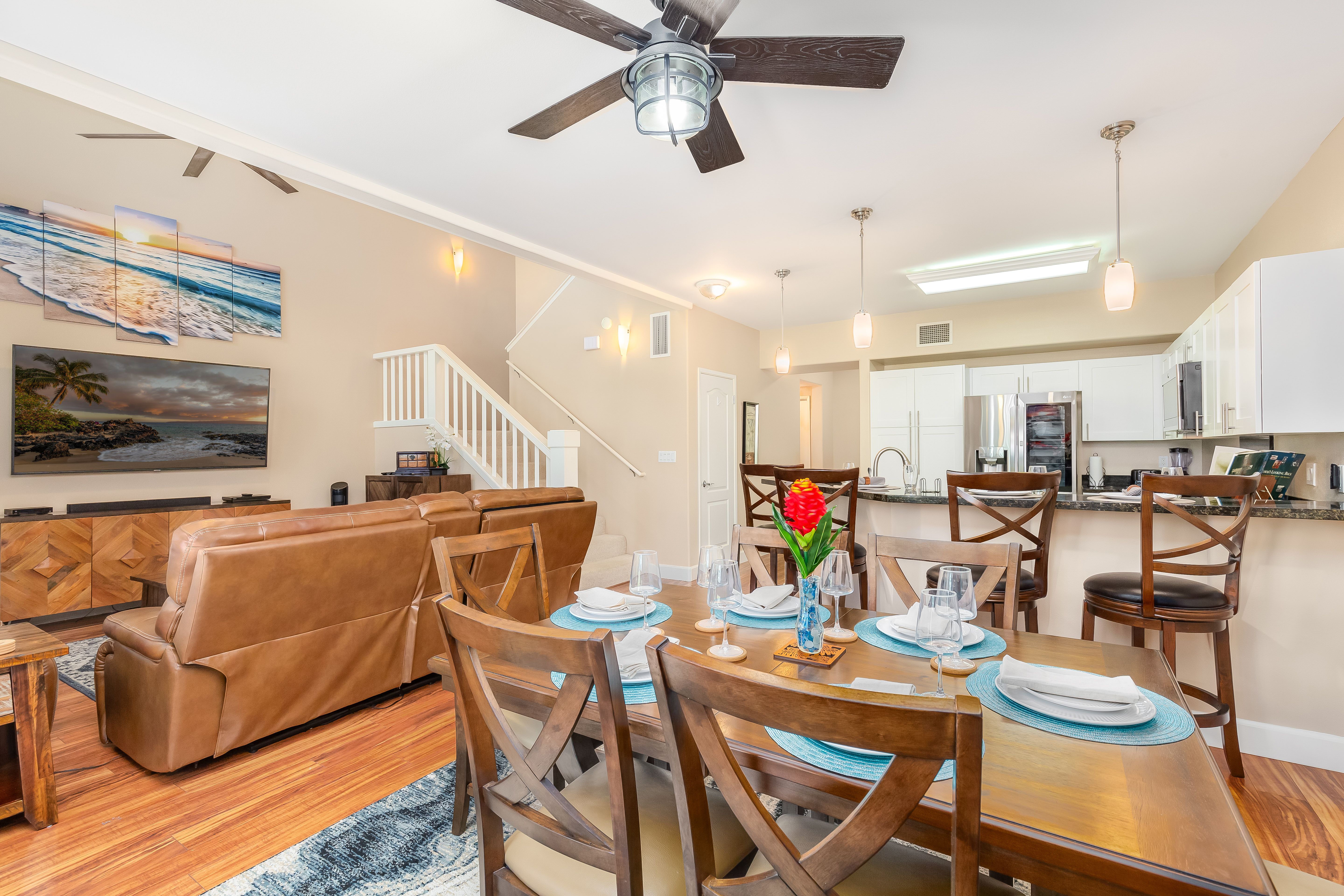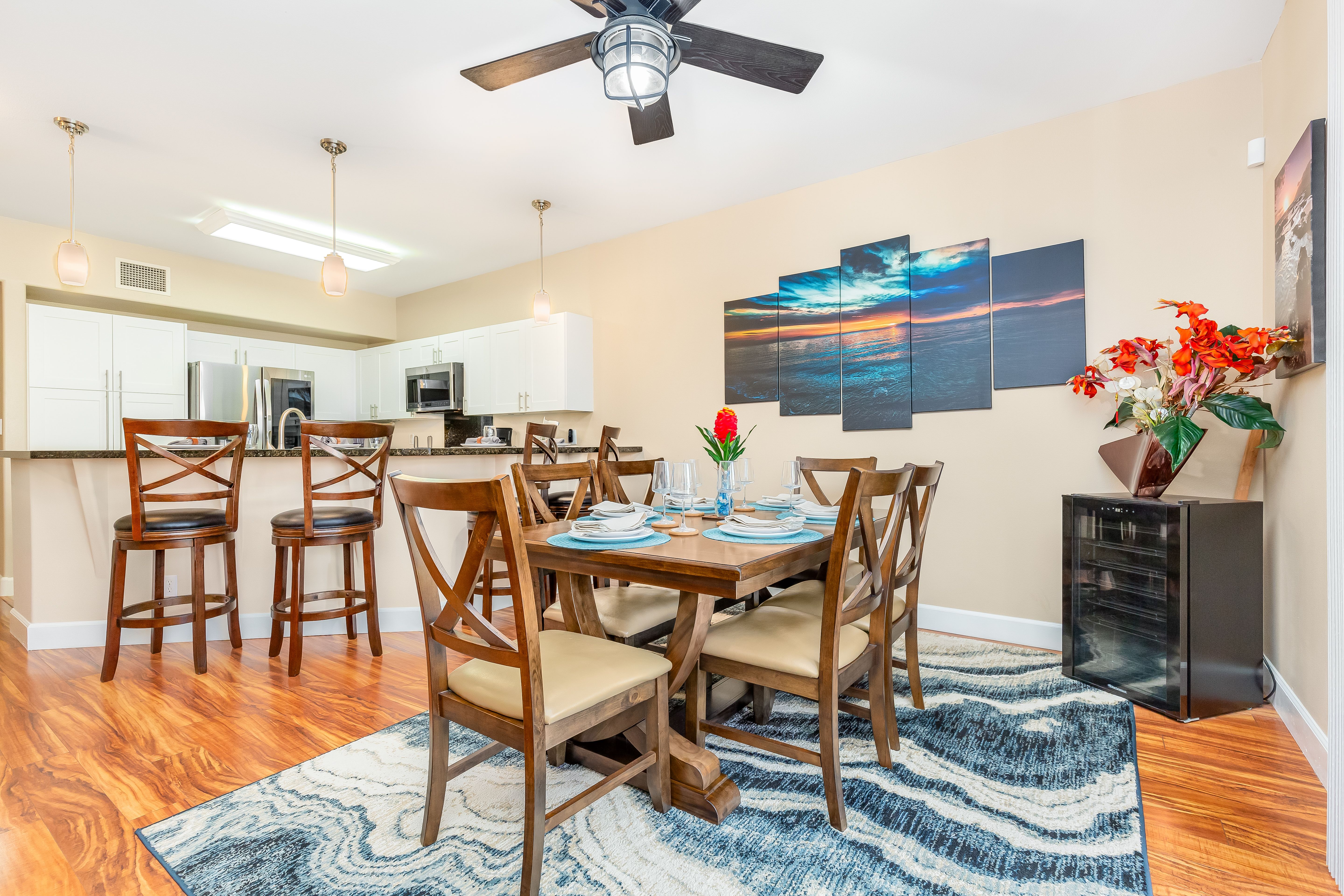 Enjoying a cozy dinner at the dining table along the kitchen isl